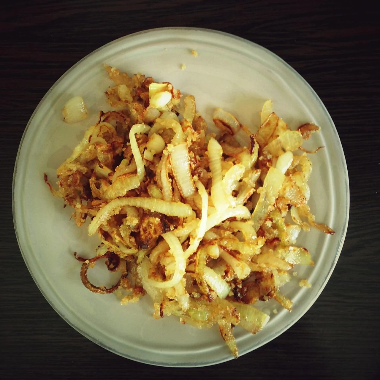 ШАГ 3 Готовый лук переложить на тарелку, покрытую бумажной салфеткой, и дать стечь лишнему маслу.