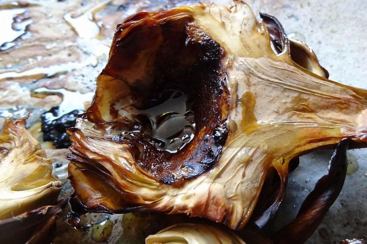 ШАГ 5 Можно совместить с запеченными в духовке артишоками. Артишоки очистить, разрезать пополам, уложить на противень, сбрызнуть маслом и запечь минут 20.