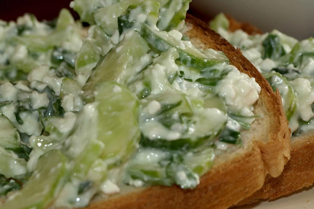 Хлебные тосты с салатом из сельдерея, огурца и творога