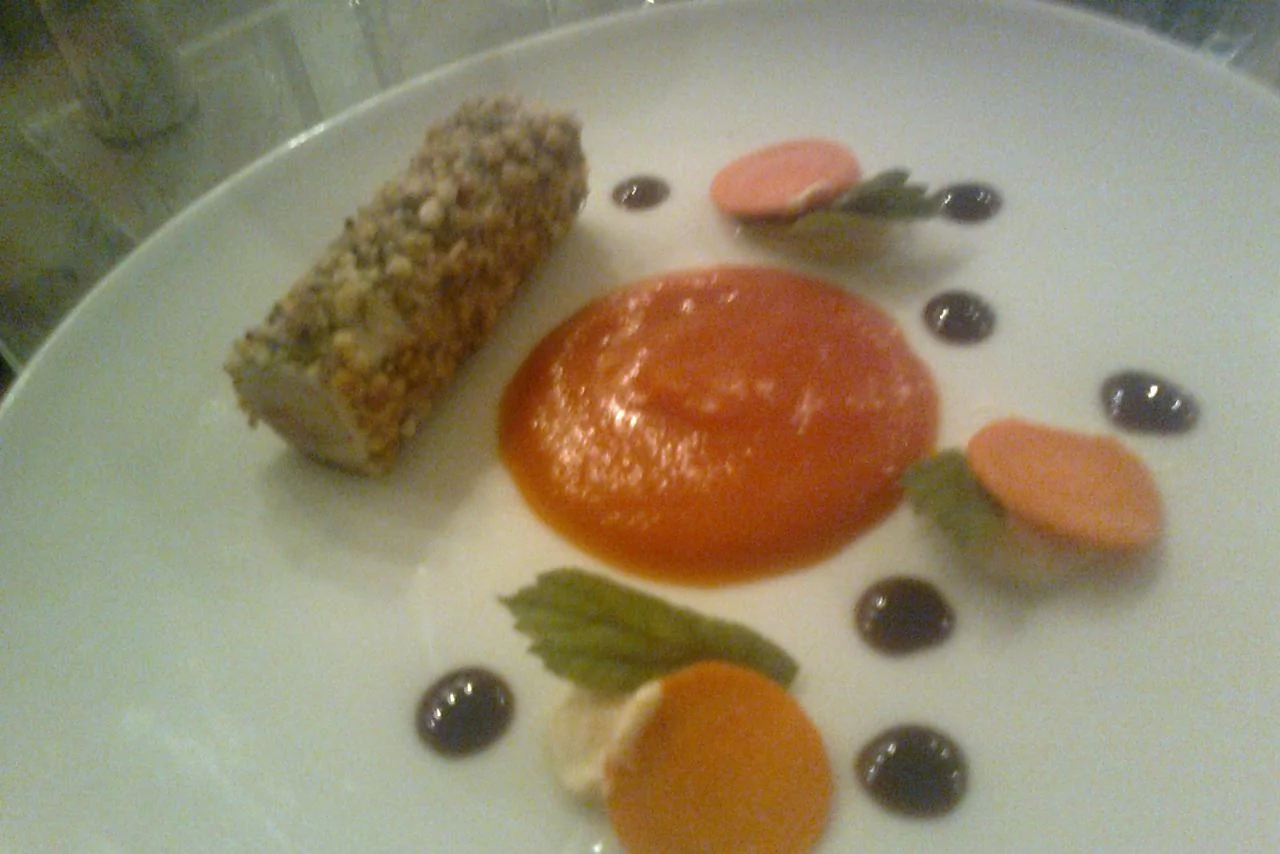 Ролл из свинины с креветкой, в панировке из трав и орехов, с пюре из сладкого картофеля