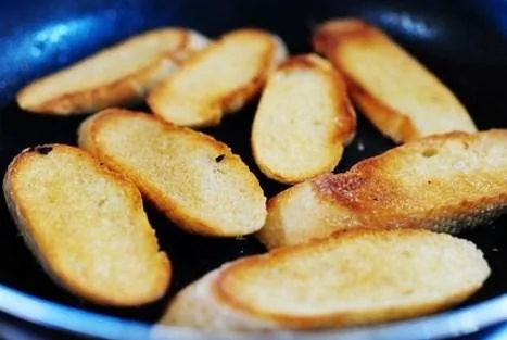 ШАГ 1 Багет нарезать на ломтики, слегка обжарить на сливочном масле, чтобы появилась золотистая корочка.