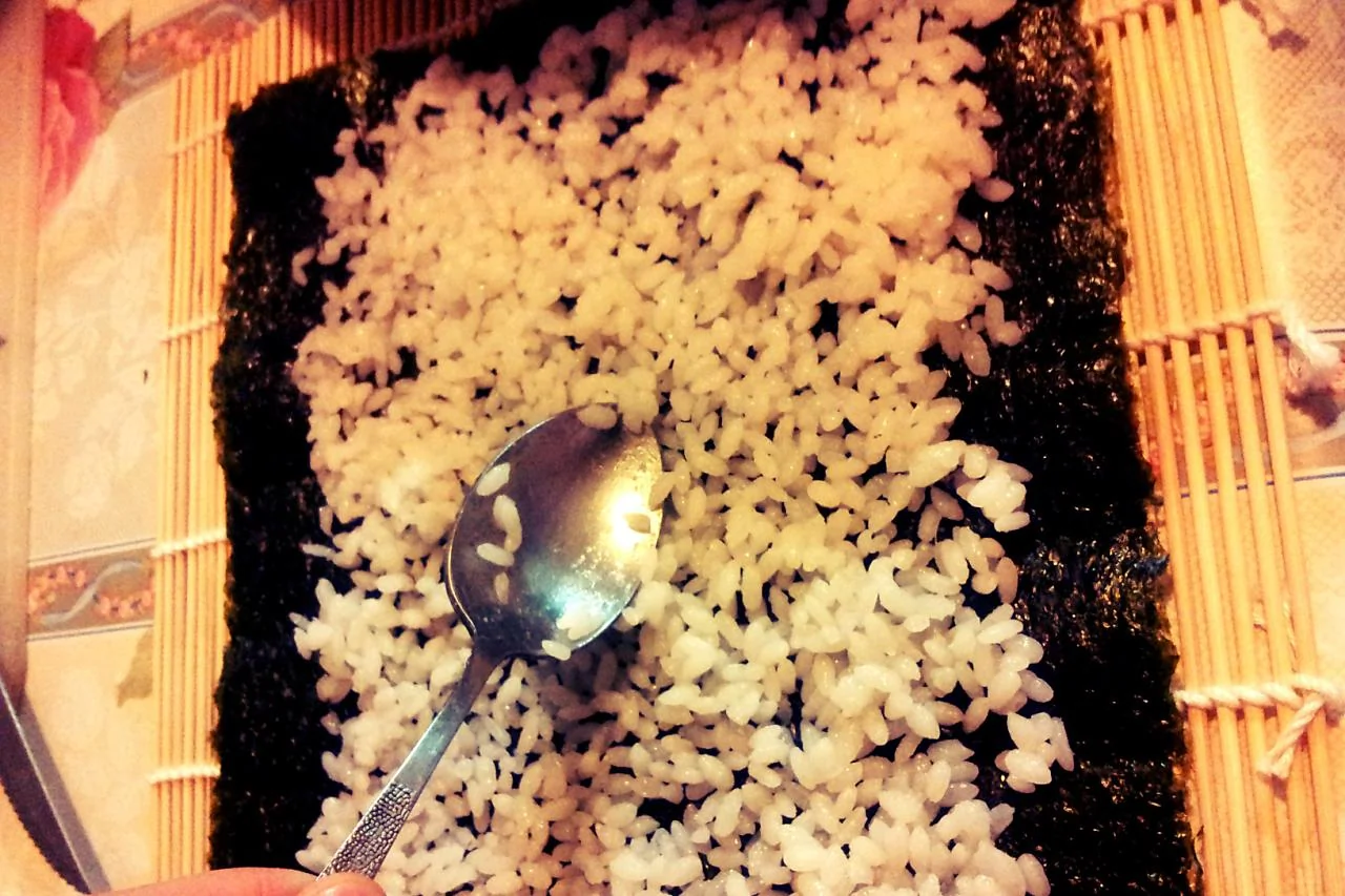 ШАГ 2 Лист нори положить блестящей стороной вниз на бамбуковую циновку (коврик), чтобы край водорослей совпадал с краем циновки. Распределите рис для суши, смачивая ладонь водой. Оставьте свободной небольшую полосу на ближнем к вам крае нори и сделайте смещение на дальнем. Спрессовывать рис не нужно, рисинки склеятся сами без дополнительных усилий с вашей стороны.