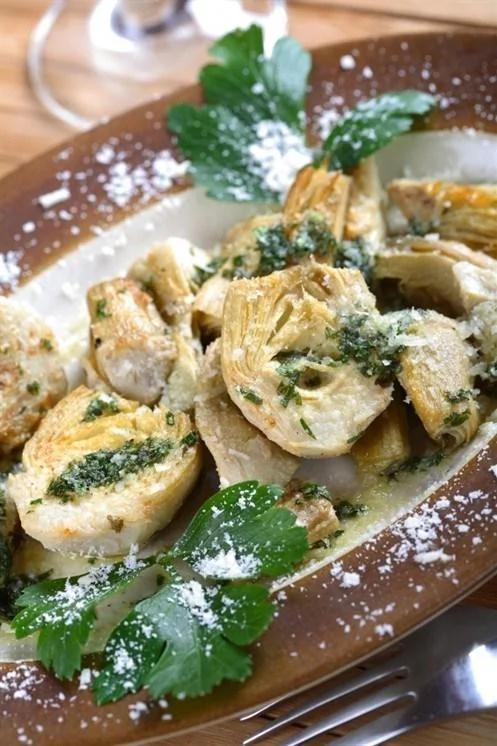 ШАГ 1 Разрежьте лимон пополам и вылейте сок одной половины в большую миску с водой. От другой половинки отрежьте тонкий ломтик. Отрежьте артишокам ножки и удалить грубые крайние листья. Обрежьте кончики оставшимся листочкам. Разрежьте артишоки вдоль пополам или на четыре части и удалите сердцевину. Полейте артишоки соком оставшейся половинки лимона и поместить в лимонную воду.