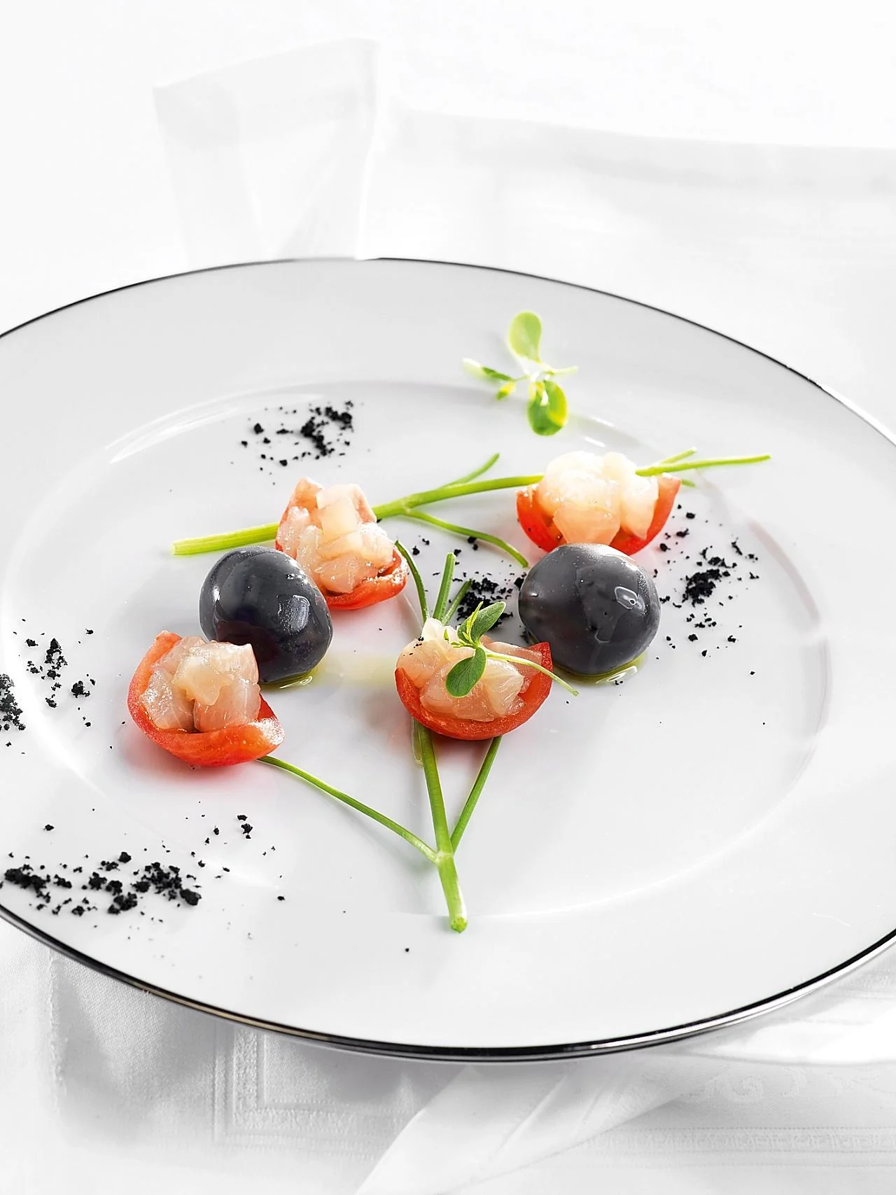 ШАГ 9 На тарелку кинуть по паре стеблей петрушки (без листьев), сверху расставить по четыре помидорных чашечки с севиче. Рядом выложить картофель в айоли.