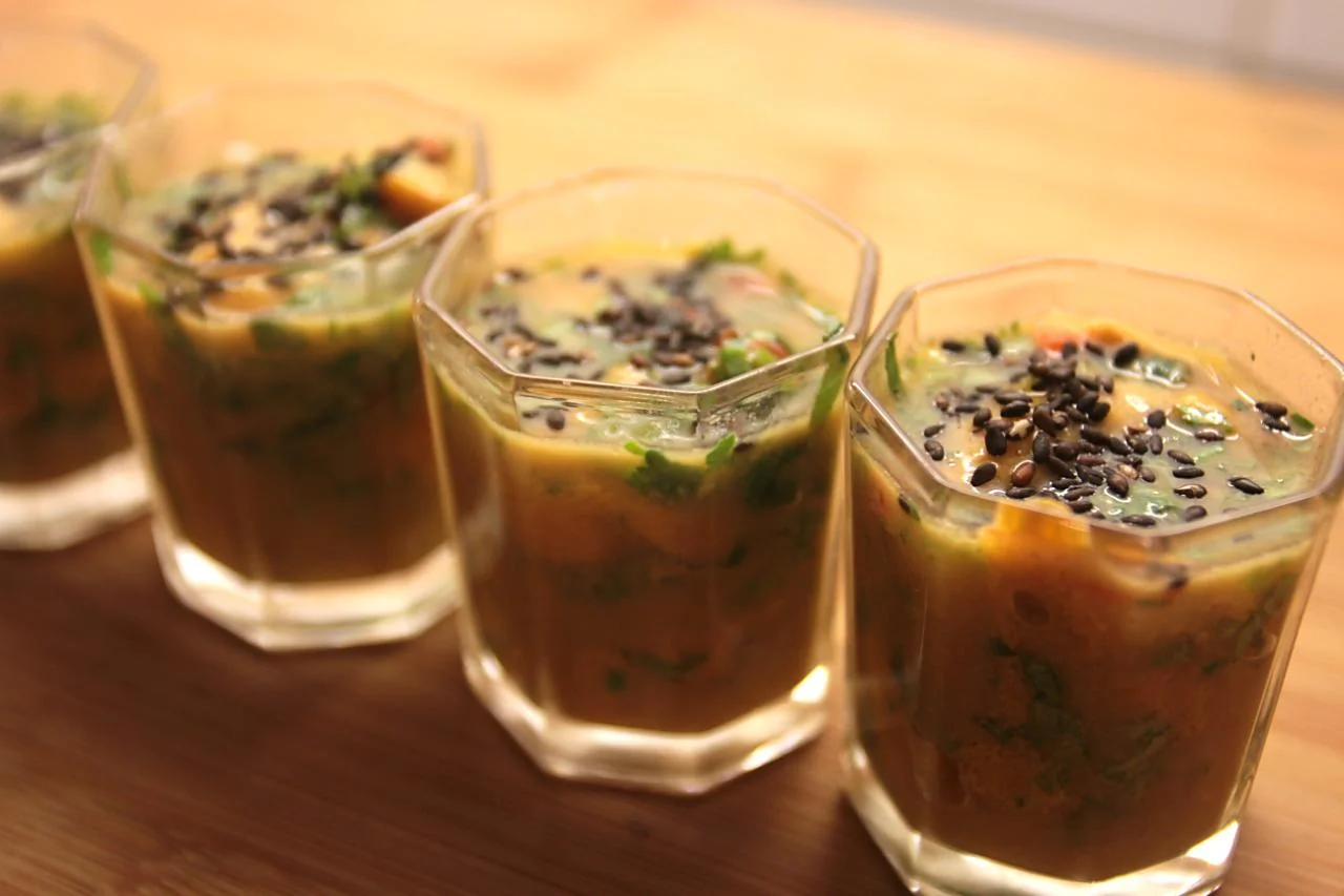 ШАГ 5 Достать, и еще раз перемешать. Разложить на порции в стопки или фарфоровые ложки для азиатских супов. Посыпать кунжутными семечками.