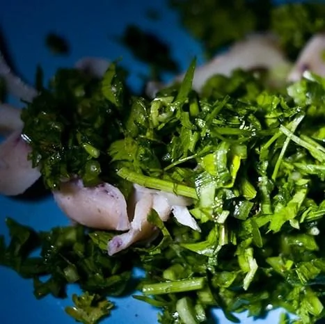 ШАГ 3 Хороший пучок зелени лука и петрушки мелко измельчить, полить маслом, перемешать, добавить к кальмару.