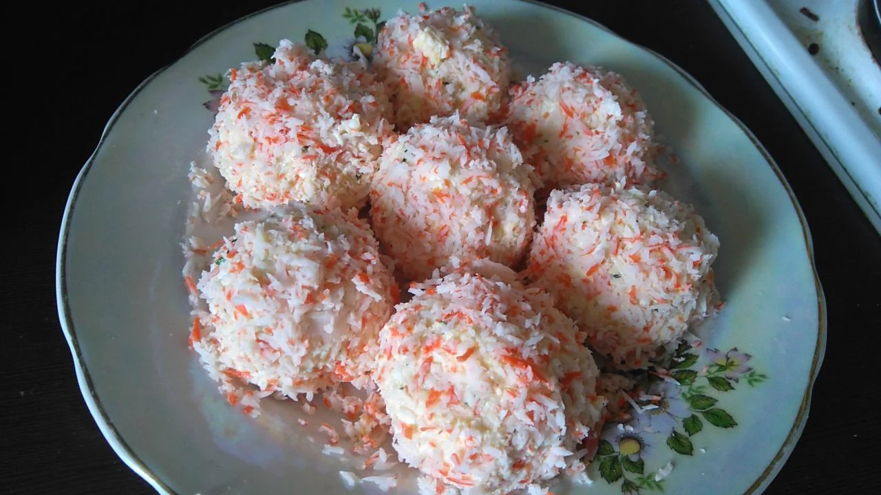 ШАГ 2 Сформировать шарики и еще раз обвалять в крабовой стружке. Подавать из холодильника.
