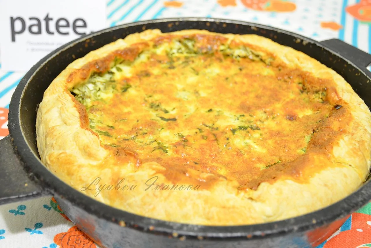 ШАГ 5 Выпекать пирог 40 минут в духовке, нагретой до 220 градусов. Вынуть, дать постоять 10 минут, нарезать на порции. Подавать в горячем или холодном виде как закуску или вместо второго блюда.