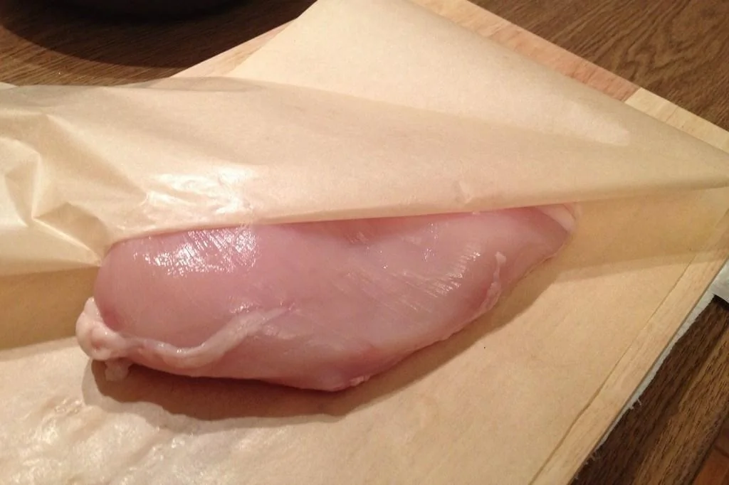 ШАГ 3 Положите грудки между двумя листами пищевой пленки или бумаги и аккуратно отбейте молотком для мяса или скалкой.