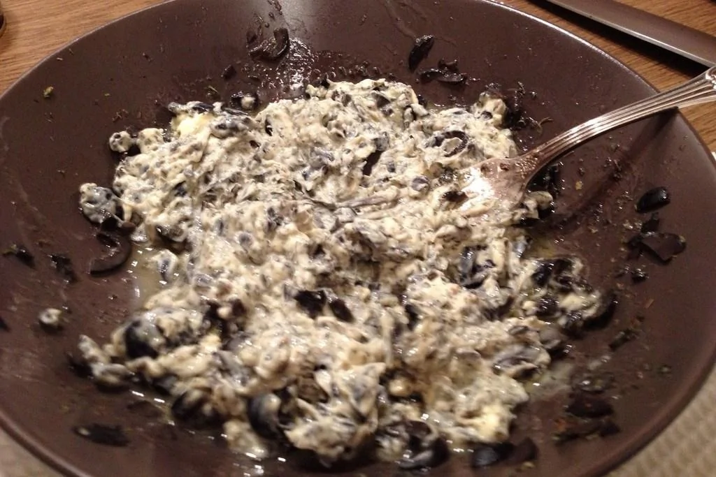 ШАГ 2 Половину оливок помните и мелко нарежьте. Смешайте в миске с петрушкой и сливочным маслом (оливки нужно взять маринованные в масле. Такие, как правило, продаются в стеклянных банках или герметичных пакетах и стоят значительно дороже, чем обычные, в жестяных банках).