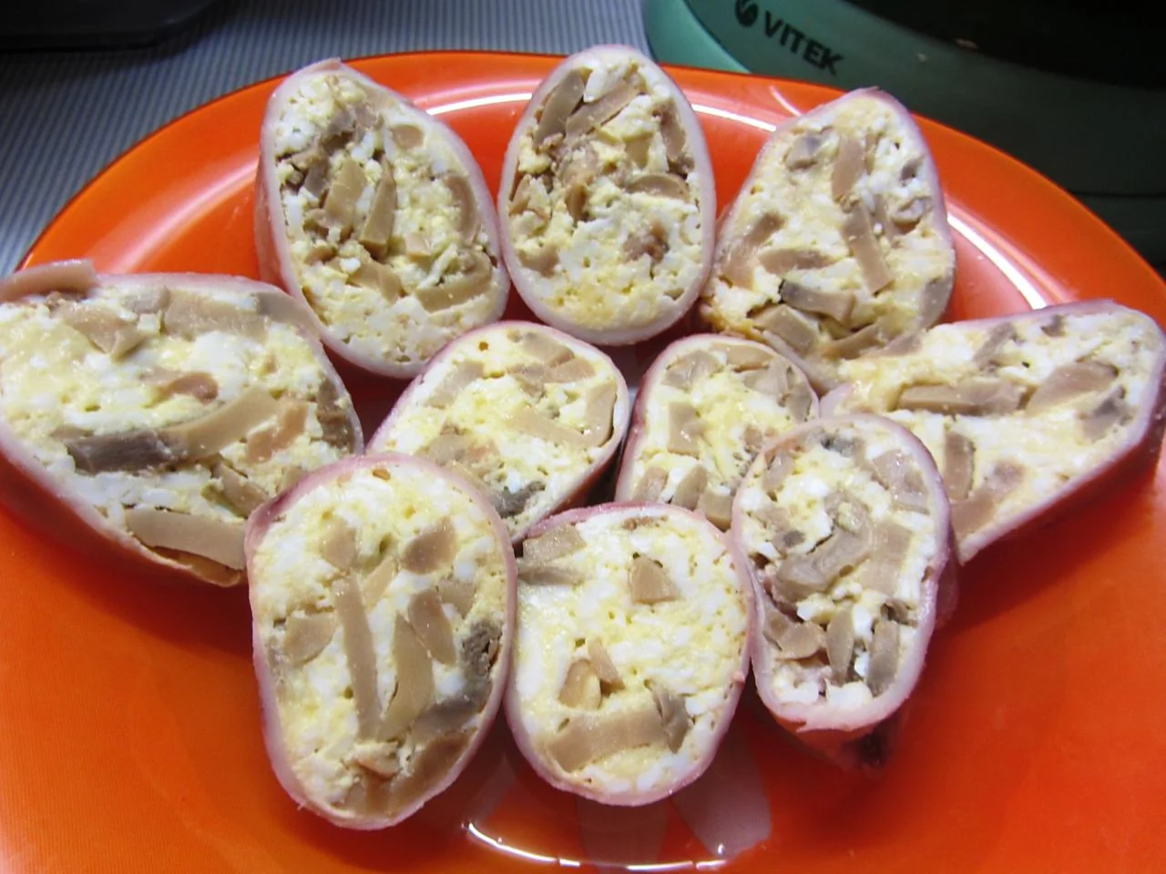 Кальмар, фаршированный грибами, яйцом и сыром