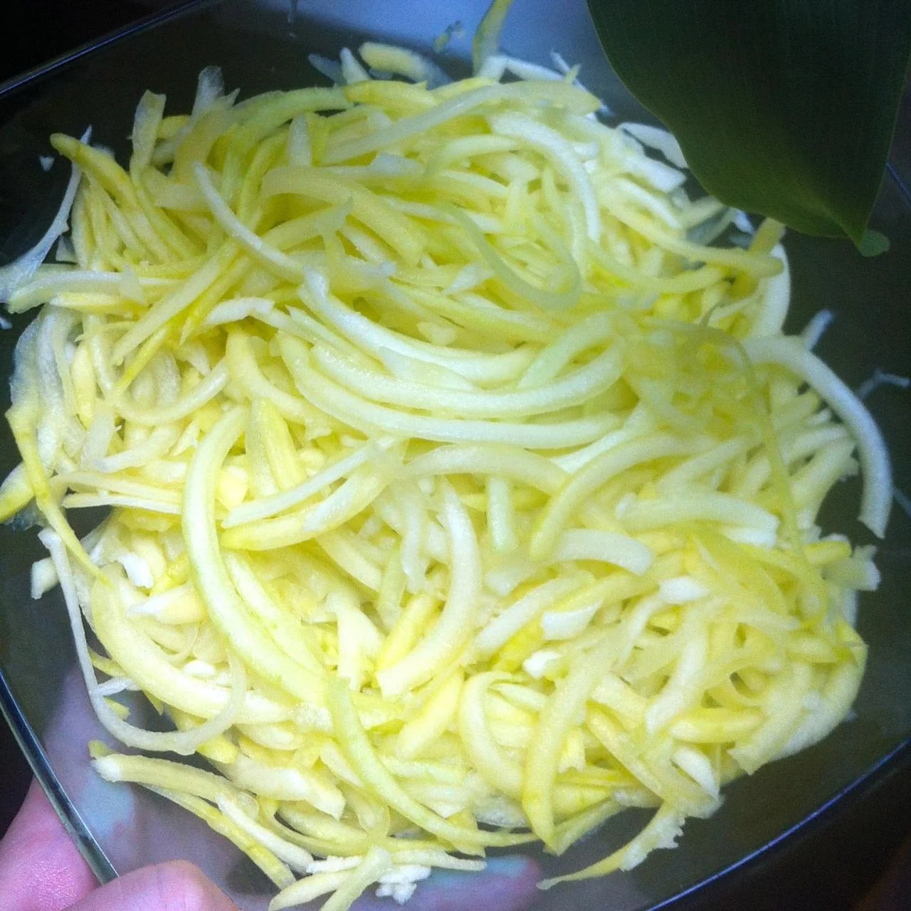 ШАГ 1 С кабачков снять кожуру, потереть на крупной терке. Посолить, перемешать и дать 30 минут выпустить сок. Немного отжать. Если этого не сделать, то в процессе приготовления, когда жаришь часть оладьев, а тесто стоит рядом, кабачки выпустят сок и будет очень жидко.