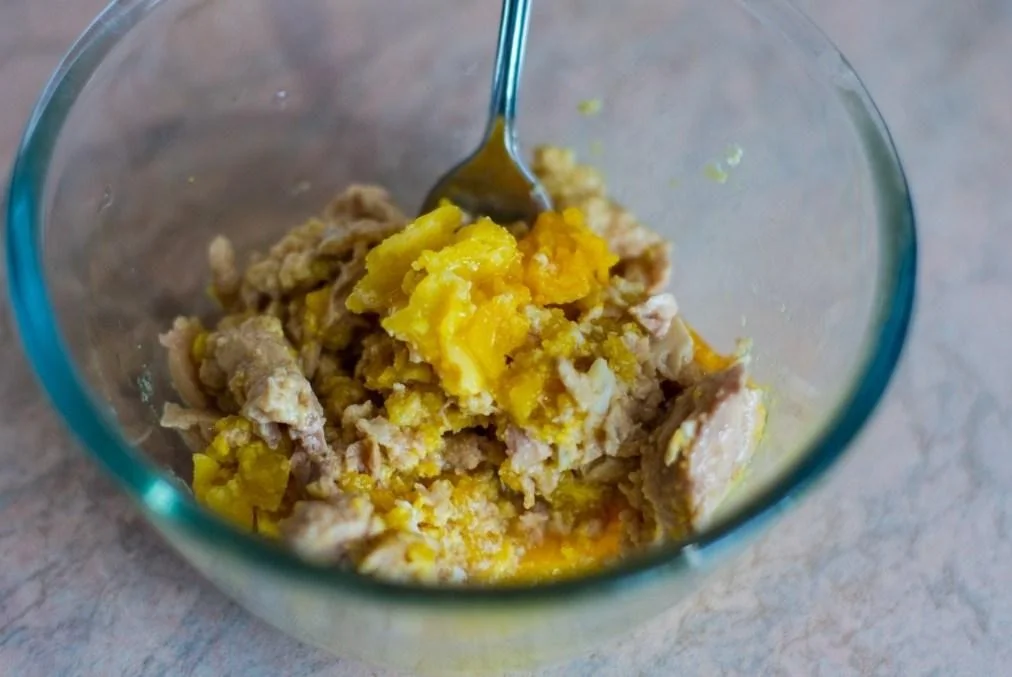 ШАГ 4 Вилкой смешиваем в однородную массу печень трески с желтком, сметаной и специями, на глаз.