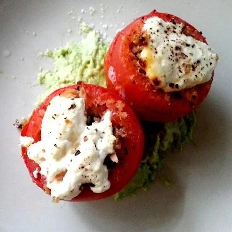 ШАГ 2 Помидоры помыть и срезать верх. Вырезать сердцевину и ложкой выложить в тарелку. Смешать киноа, рубленную фету, базилик, оливки, артишоки, масло (при желании добавьте чеснок), добавить немного томатной мякоти. Каждый помидор нафаршировать смесью. Сверху выложить немного феты.