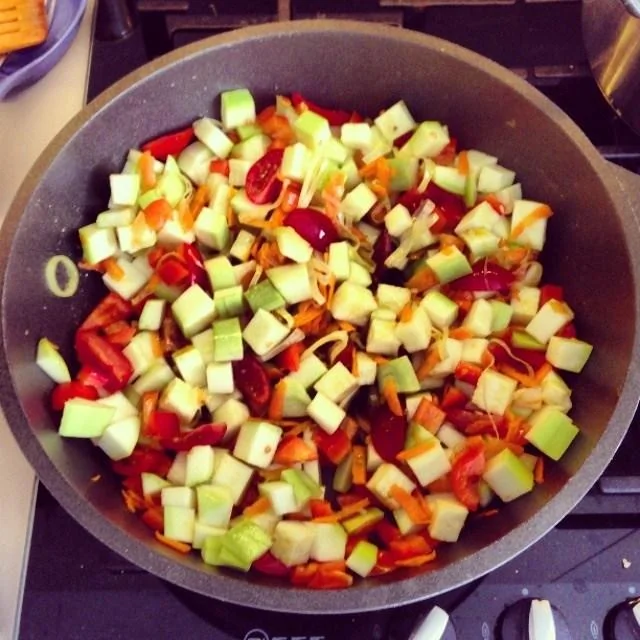 ШАГ 2 На разогретую сковороду наливаем оливковое масло, овощи кладем в следующей последовательности: лук, морковь, кабачок, перец, черри. Солим. В конце можно добавить чеснок. Тушим примерно 20–25 минут.
