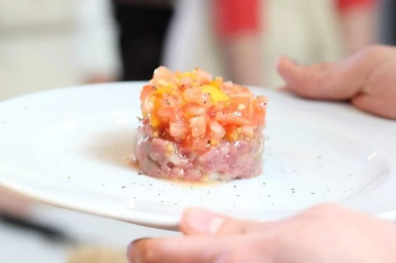 ШАГ 5 Берем круглую форму, выкладываем сначала мясо, после — помидоры с перцем, сверху выкладываем перепелиный желток, сверху — посыпаем черным перцем.