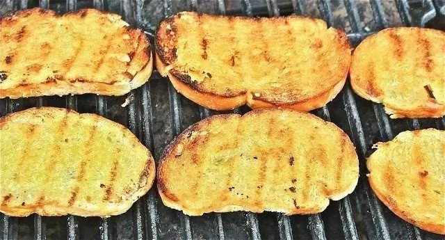 ШАГ 2 Каждый кусок хлеба сбрызните оливковым маслом с обеих сторон. Обжарьте на гриле каждую сторону в течение 2–3 минут.