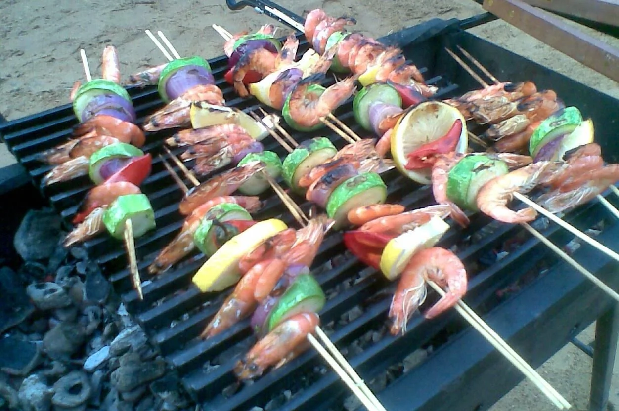 ШАГ 1 Лимон, лук, цукини и перец нарезать, замариновать с тигровыми креветками на 1 час. Для маринада смешать белое сухое вино, розмарин, сумах и мелко нарубленный чеснок. Затем нанизать на шпажки, посолить, сбрызнуть оливковым маслом и обжарить на гриле до готовности.