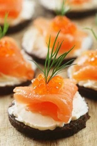 ШАГ 1 На каждую Biscofrisa наносим очень тонким слоем оливковый или клубничный джем. Затем покрываем сыром Филадельфия, кладем нарезанную тонко семгу, как на картинке. Декорируем красной икрой и маленькой веточкой зелени.