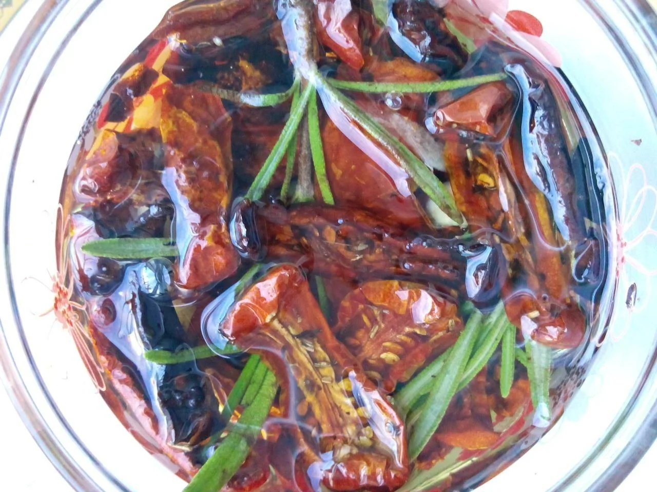 ШАГ 7 Помидоры слегка «утрамбовать», но сильно не придавливать их, сверху добавить немного розмарина, а затем залить остатками масла так, чтобы масло полностью покрывало помидоры (если не будет покрывать, то помидоры будут портиться). Закрыть крышкой и убрать в темное, прохладное место (лучше в холодильник).