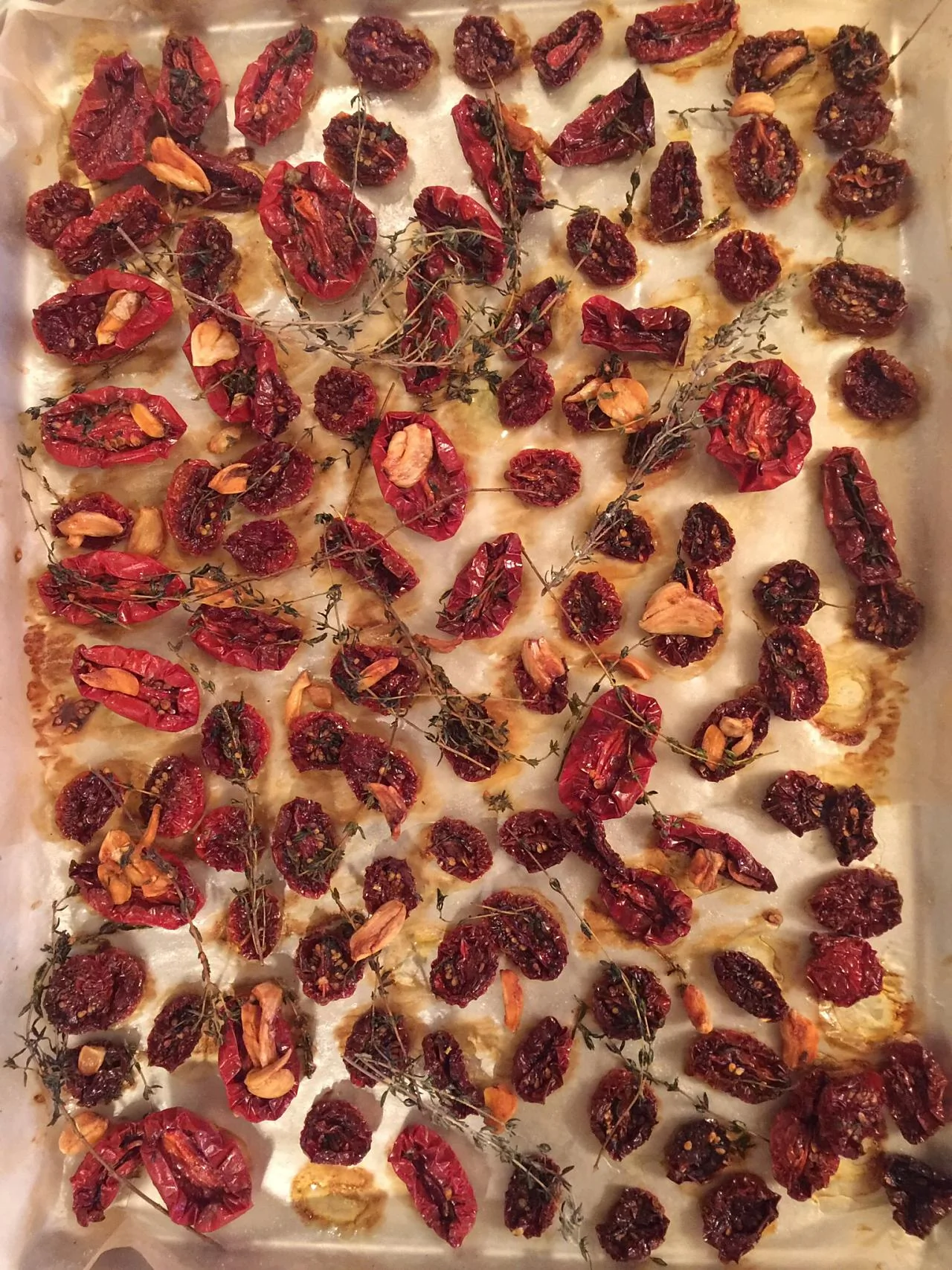 ШАГ 3 Духовку нагреть до 60–100 градусов. Поставить противень с помидорами в духовку (дверцу духовки держать слегка приоткрытой, чтобы влага быстрее испарялась). Если духовка имеет функцию конвекция, то иногда, можно понижать температуру и включать конвекцию.