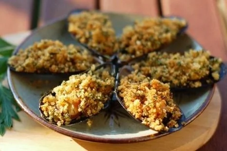 ШАГ 3 Мидии с одной створкой выложите на противень, засыпанной морской или крупной солью. Наполните приготовленной смесью. Запекайте под грилем 5 минут до золотистой корочки. Сверху сбрызните лимоном.