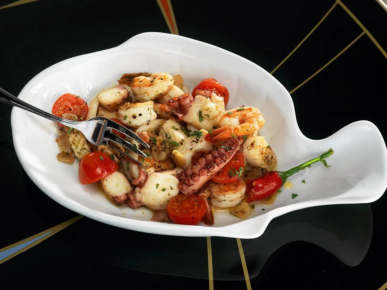Жареные морепродукты с чесноком и томатами