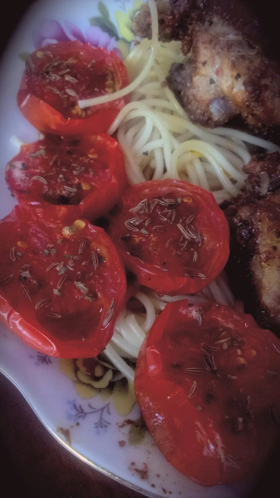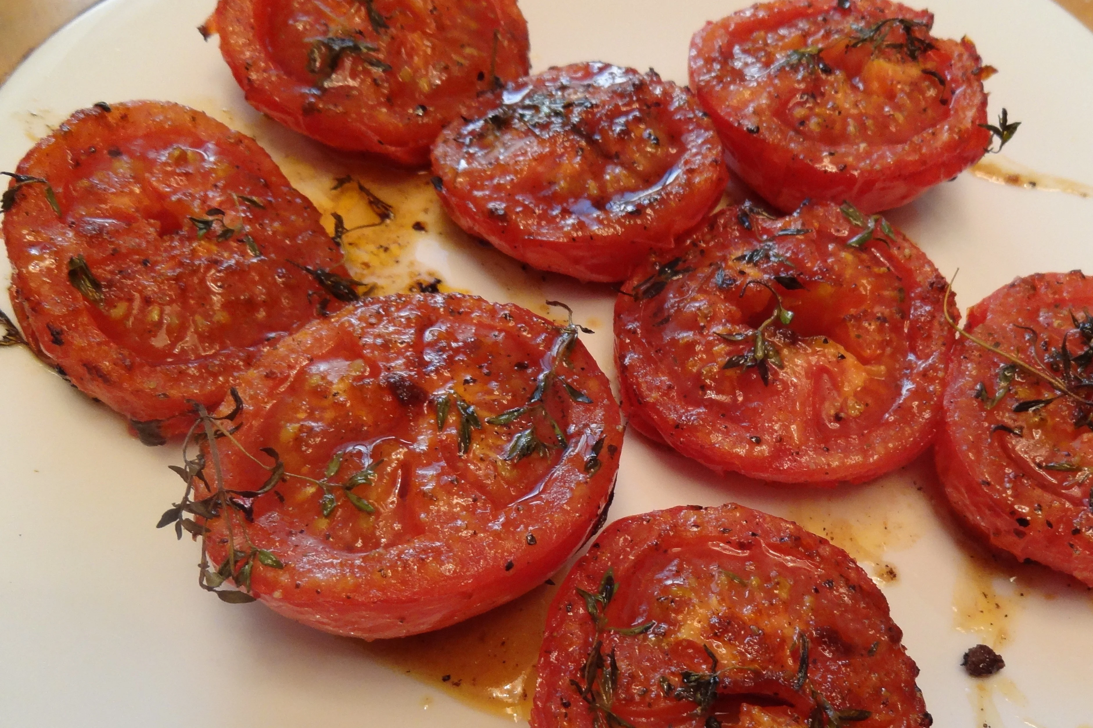 ШАГ 3 На пергамент уложить помидоры, разрезом вверх. Приправить: соль, перец, паприка, чуть сахара на каждую половинку (помидоры любят сахар), присыпать тимьяном.