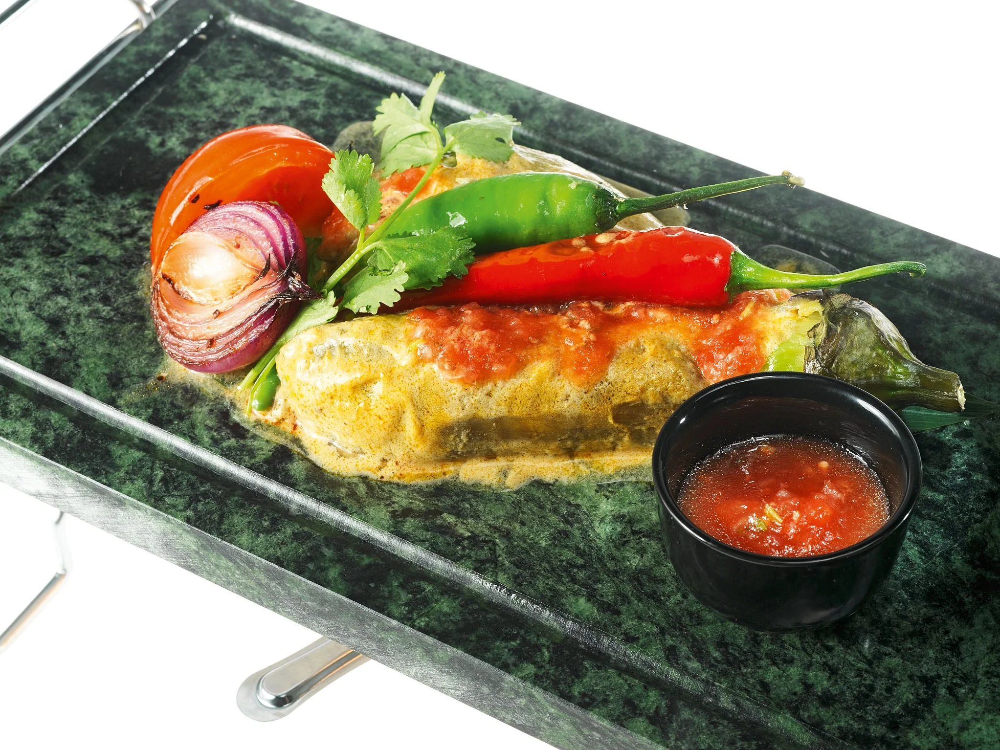 ШАГ 3 Выложить баклажан на блюдо, щедро полить соусом. Добавить перец чили, половину помидора, половину красной луковицы. И то, и другое, и третье можно использовать в свежем виде, но лучше поджарить без масла. Завершить композицию веткой кинзы и плошкой с острым томатным соусом.