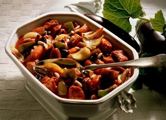 ШАГ 1 Баклажаны и помидоры очистить от кожицы и нарезать кружочками, лук — полукольцами, перец — соломкой. Подготовленные овощи обжарить на масле, залить соусом с добавлением бульона, заправить чесноком, молотым перцем, солью и протушить 15–20 минут.