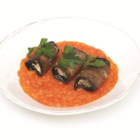 ШАГ 1 Рулетики из баклажан выкладываем в центр тарелки (9 или 10 штук, в зависимости от ширины рулета, при необходимости рулет-заготовку делим пополам), начинкой вверх.