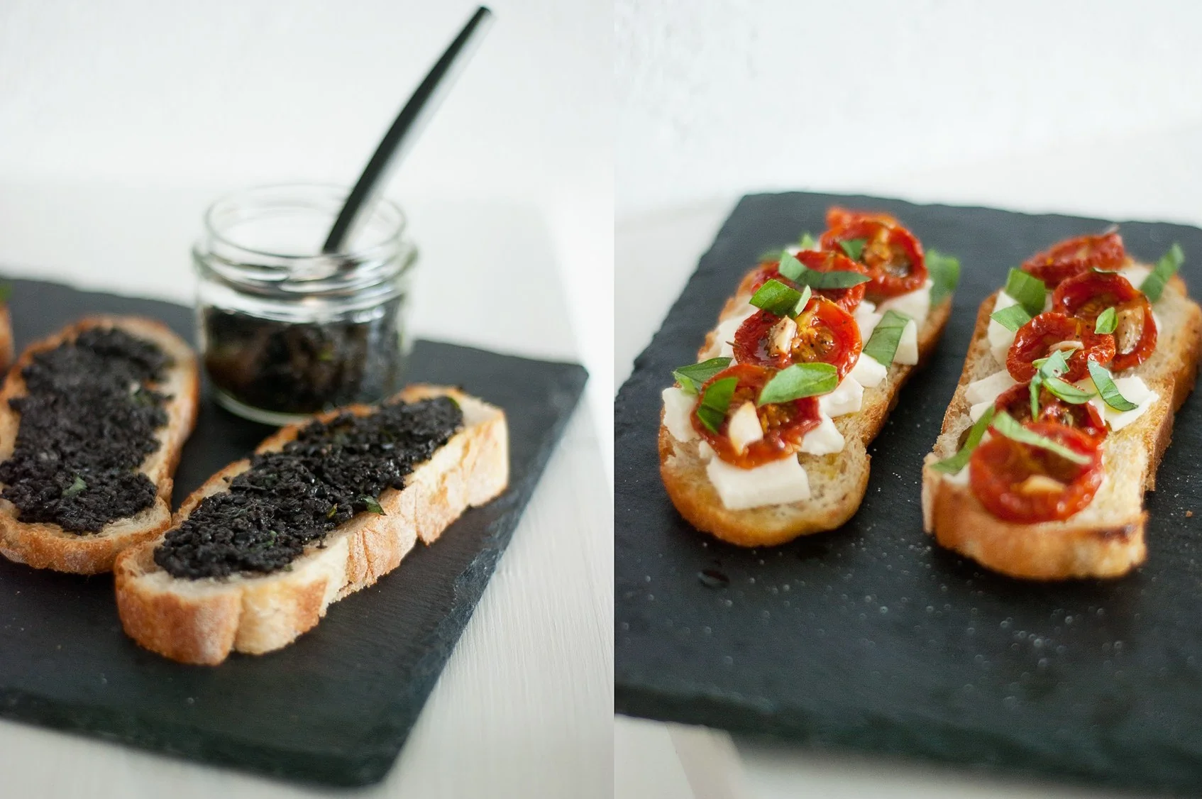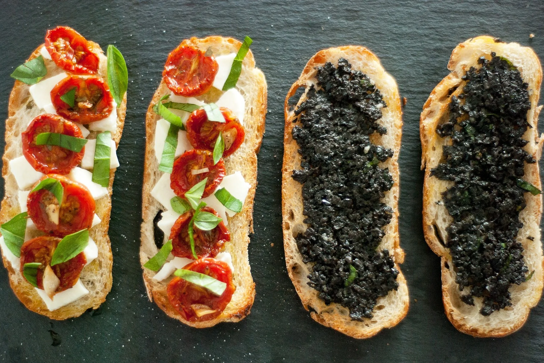 Ингредиенты для приготовления Брускетта с вялеными томатами и оливковым тапенадом: