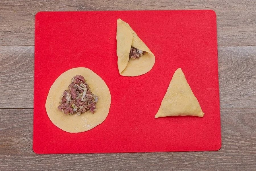 ШАГ 6 Начините раскатанное тесто фаршем, загните края поочередно так, чтобы получилась форма треугольника, выложите на противень, смажьте слегка взбитым яйцом, посыпьте кунжутом и запекайте при температуре 180 градусов в течение 20-ти минут.