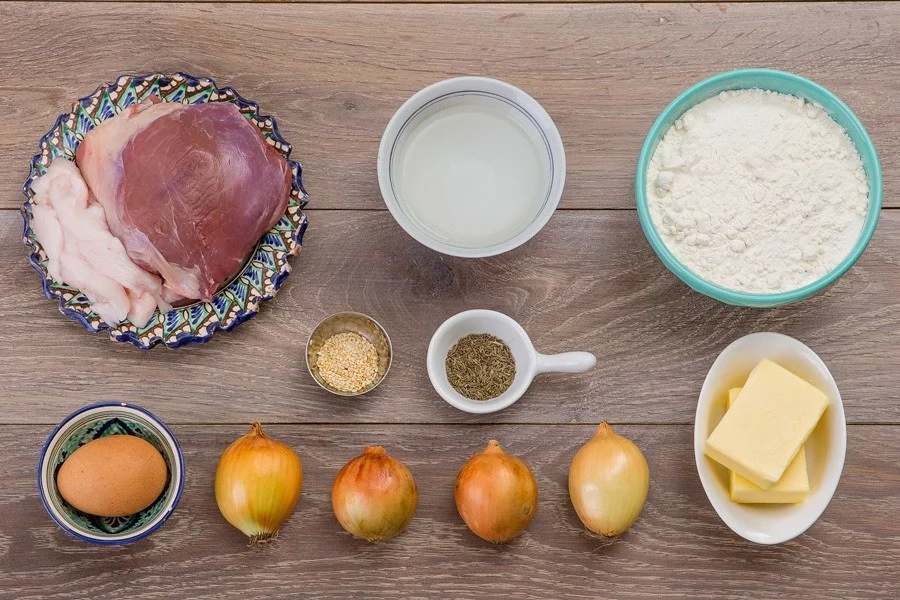 ШАГ 3 Очистите и нарежьте лук мелким кубиком, нарежьте баранину и курдюк мелким кубиком, растолките в ступке или мелко нарубите ножом перец горошком и зиру.