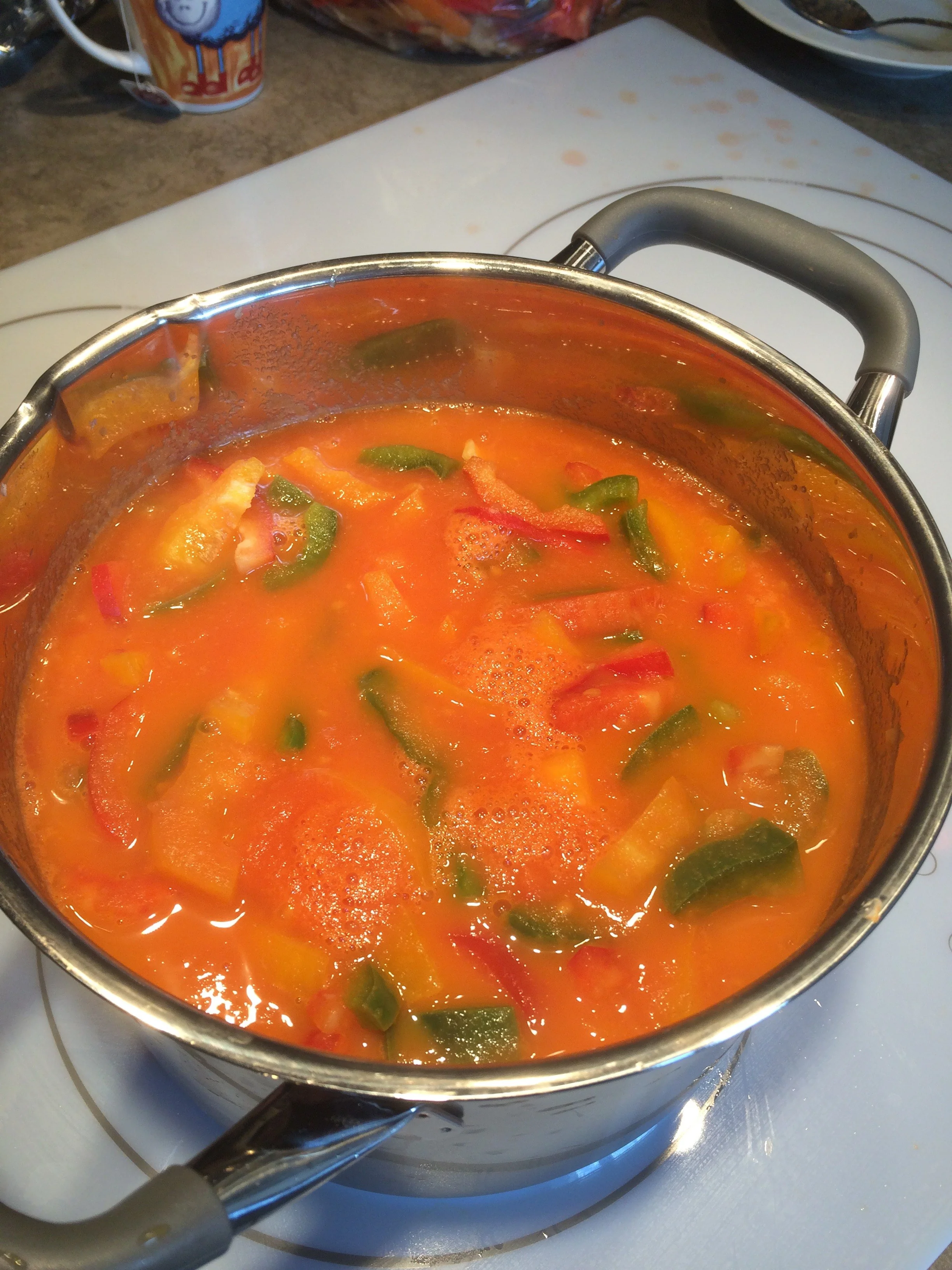 ШАГ 4 Добавить к помидорам нарезанный болгарский перец, дать покипеть 7 минут.