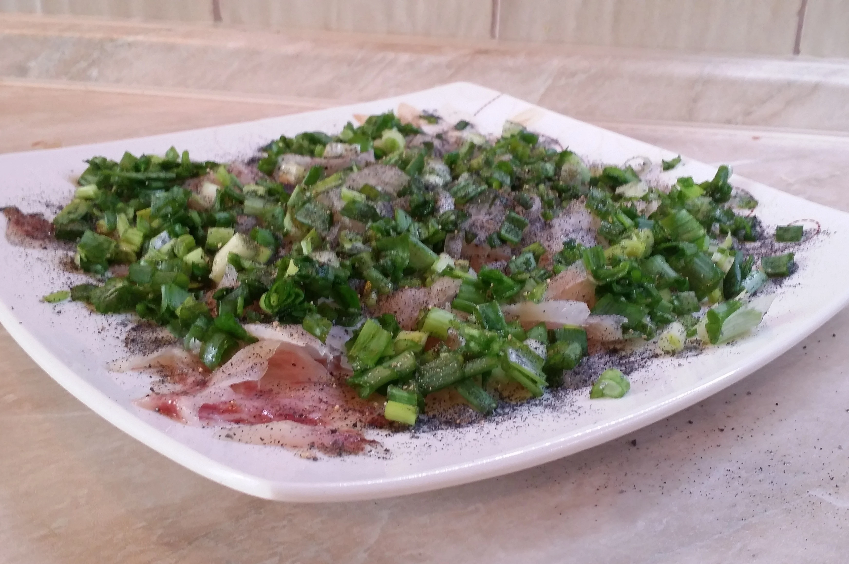 ШАГ 3 Выложить ломтики на предварительно подмороженные тарелки, посыпать смесью соли и перца и нарезанным тонкой соломкой зеленым луком. И тут же съесть, не дожидаясь, пока рыба разморозится.