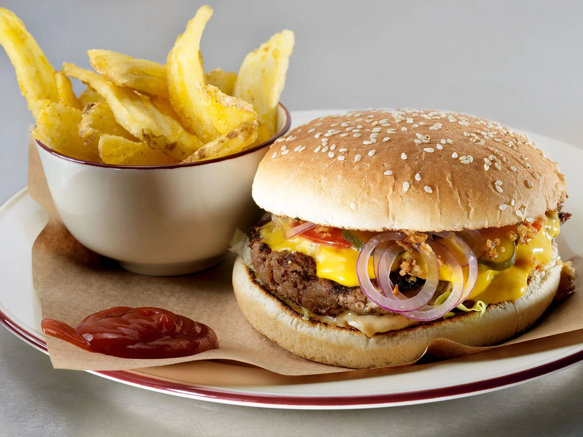 ШАГ 4 Подавать бургер с картофелем фри и кетчупом.