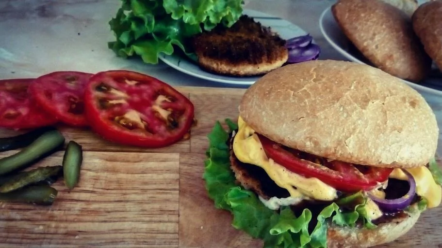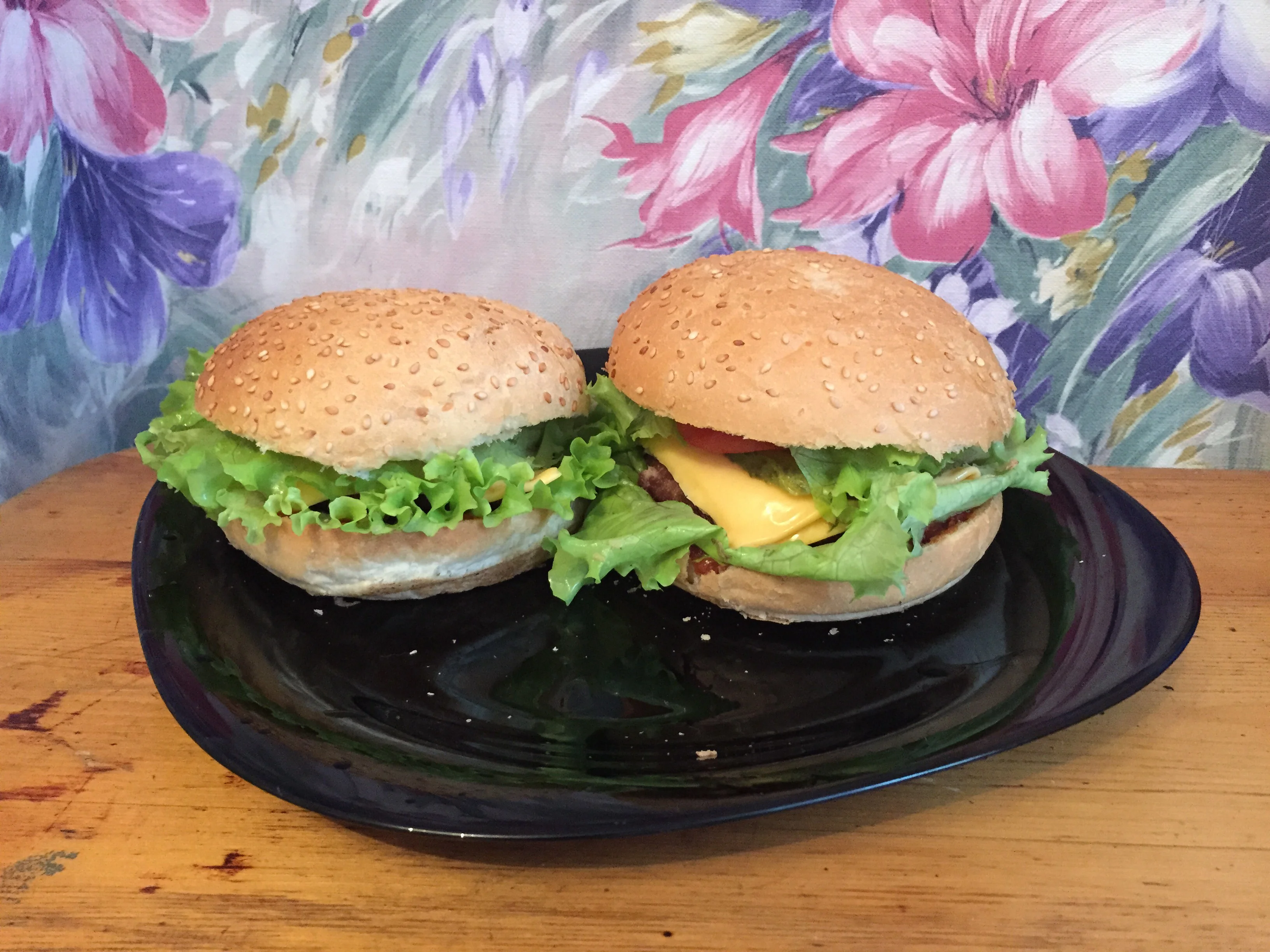 ШАГ 3 Круглую булочку для бургера разрезать надвое, слегка поджарить на сковороде-гриль половины с внутренней стороны. На нижнюю половину постелить салат «Айсберг», добавить следом соус для бургера, на него положить котлету, полить ее сырным соусом «Чеддер», сверху выложить нарезанные помидоры, огурцы, тонкие колечки красного лука и посыпать жареным хрустящим луком. Накрыть второй половиной булки.