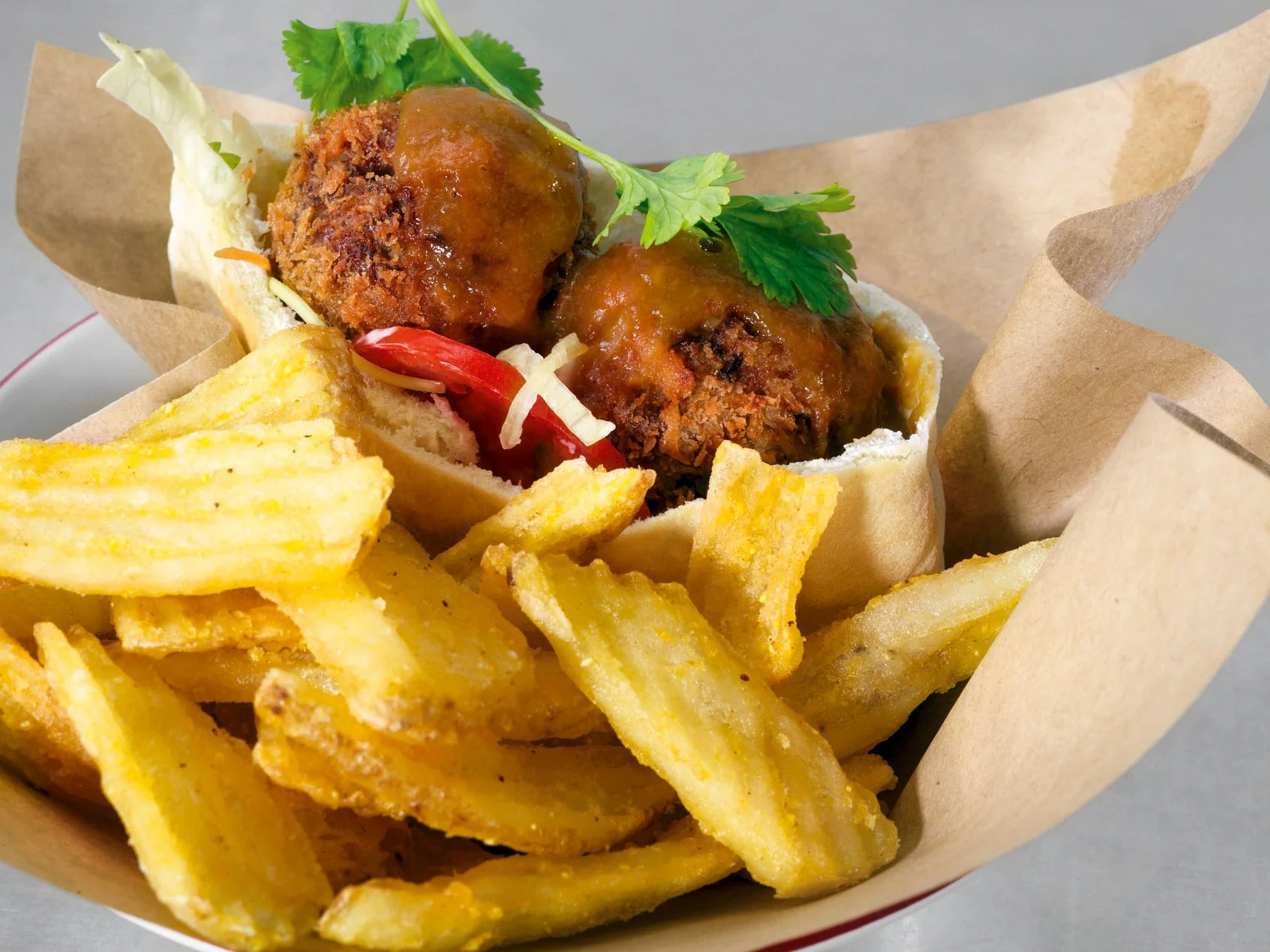 ШАГ 8 Сформировать из мяса шарики размером с фалафель, запанировать в сухарях панко и обжарить во фритюре.