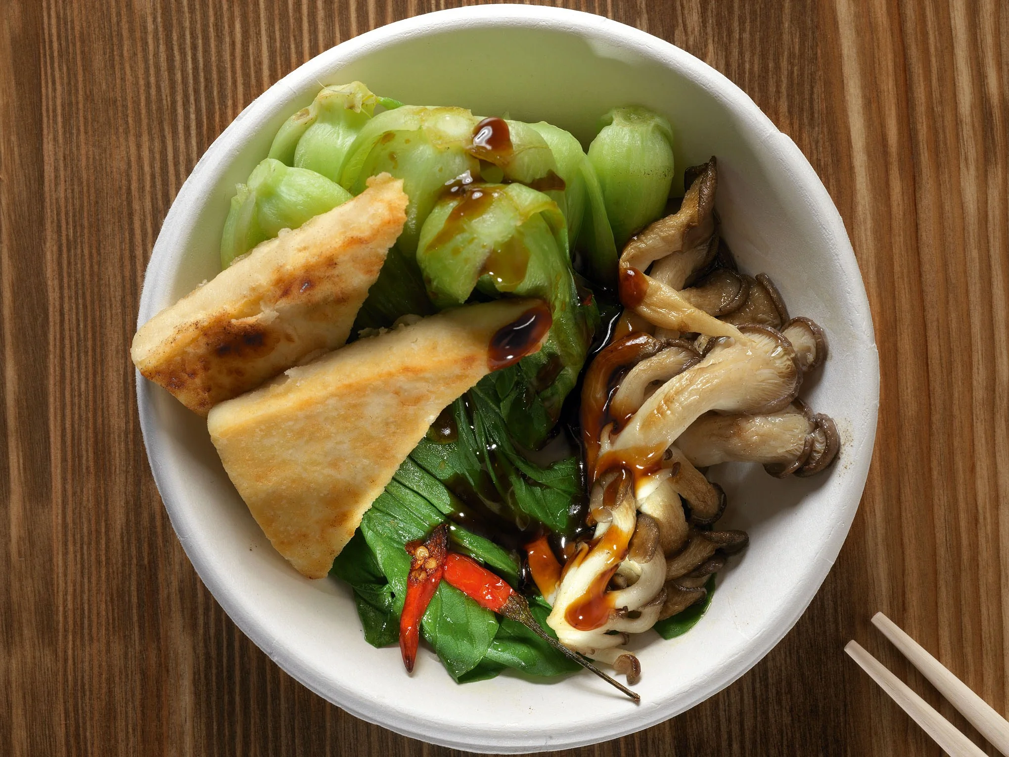 ШАГ 4 В глубокую тарелку выложить салат, на него — тофу, рядом расположить вешенки. Заправить салат оставшимся соусом.