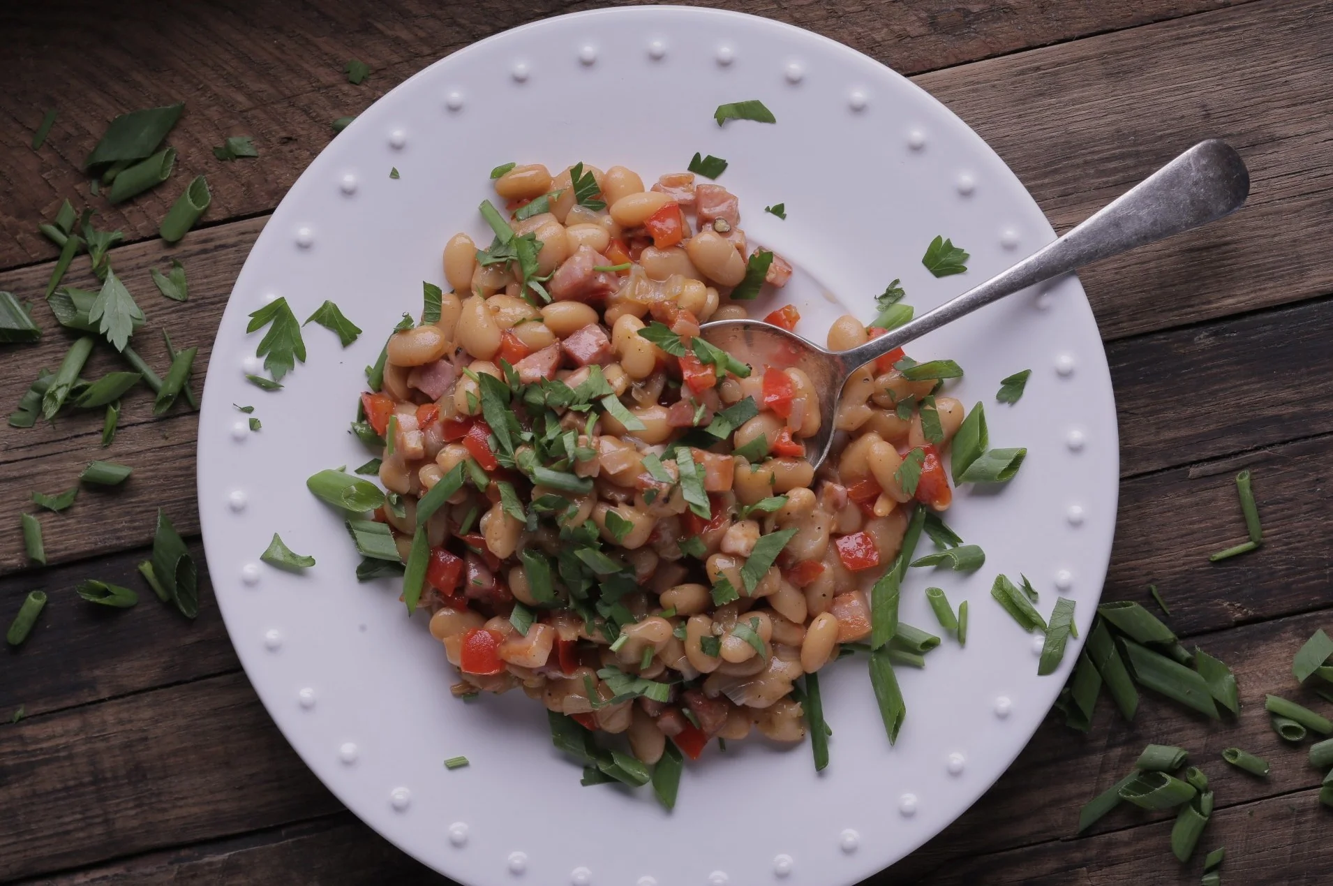 ШАГ 3 Добавляем фасоль, тимьян, лавровый лист, перемешиваем и заливаем бульоном. Заправляем по вкусу.