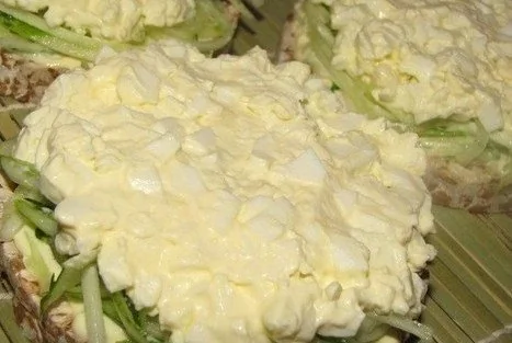 ШАГ 3 Хлебцы слегка смазать майонезом, положить слой огурцов, на них выложить яйца, а сверху кусочки горбуши.