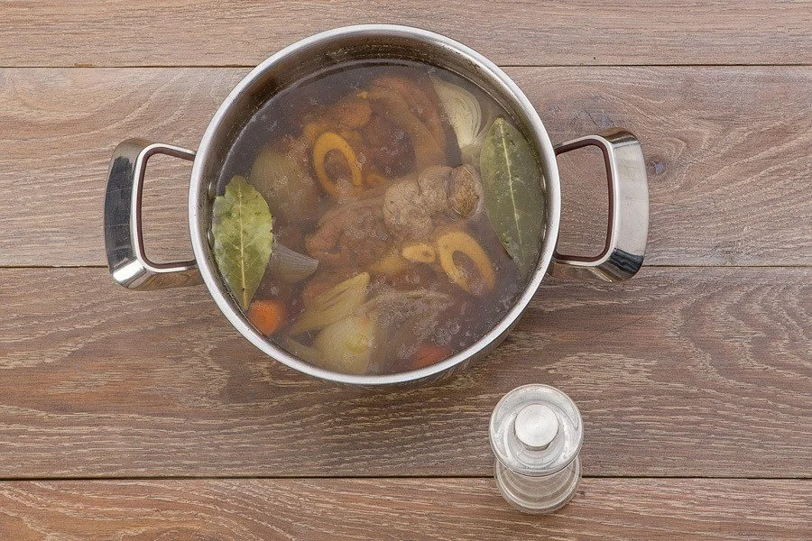 ШАГ 3 Добавьте лавровый лист, черный перец горошком, посолите и варите еще 30 минут.