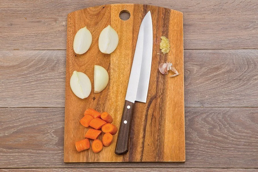 ШАГ 1 Раздавите, очистите и мелко нарубите чеснок, разотрите в пюре, очистите, нарежьте морковь крупными кусками, разрежьте лук на 4 части.