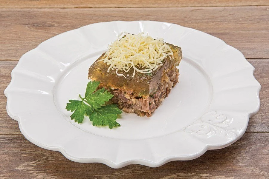 ШАГ 7 Нарежьте холодец, украсьте листьями петрушки, подавайте с хреном.