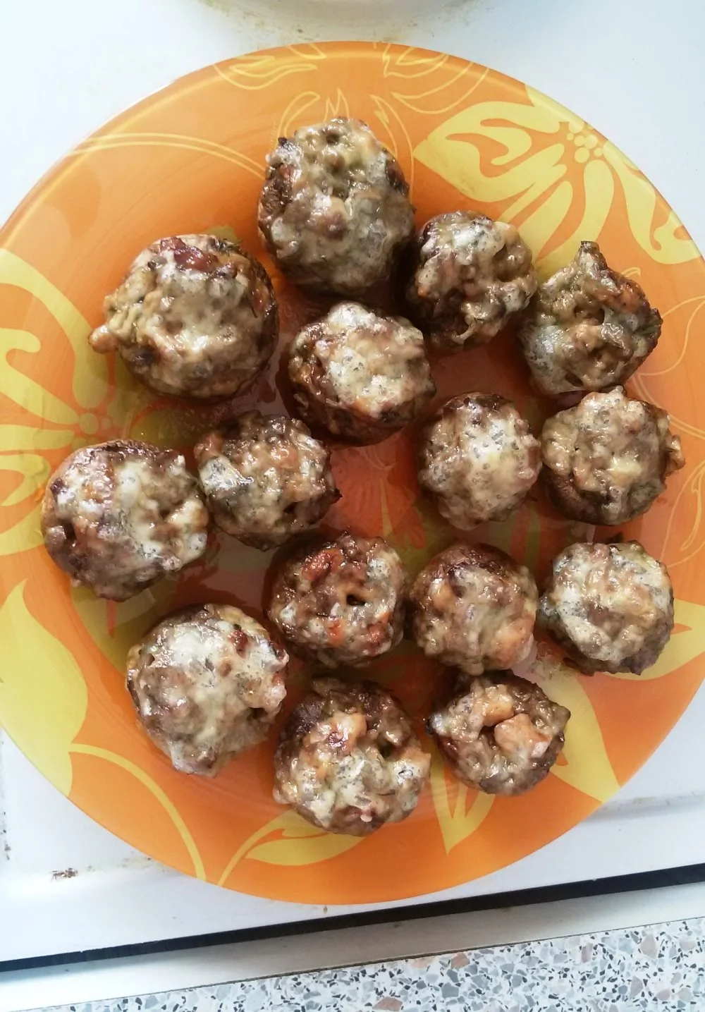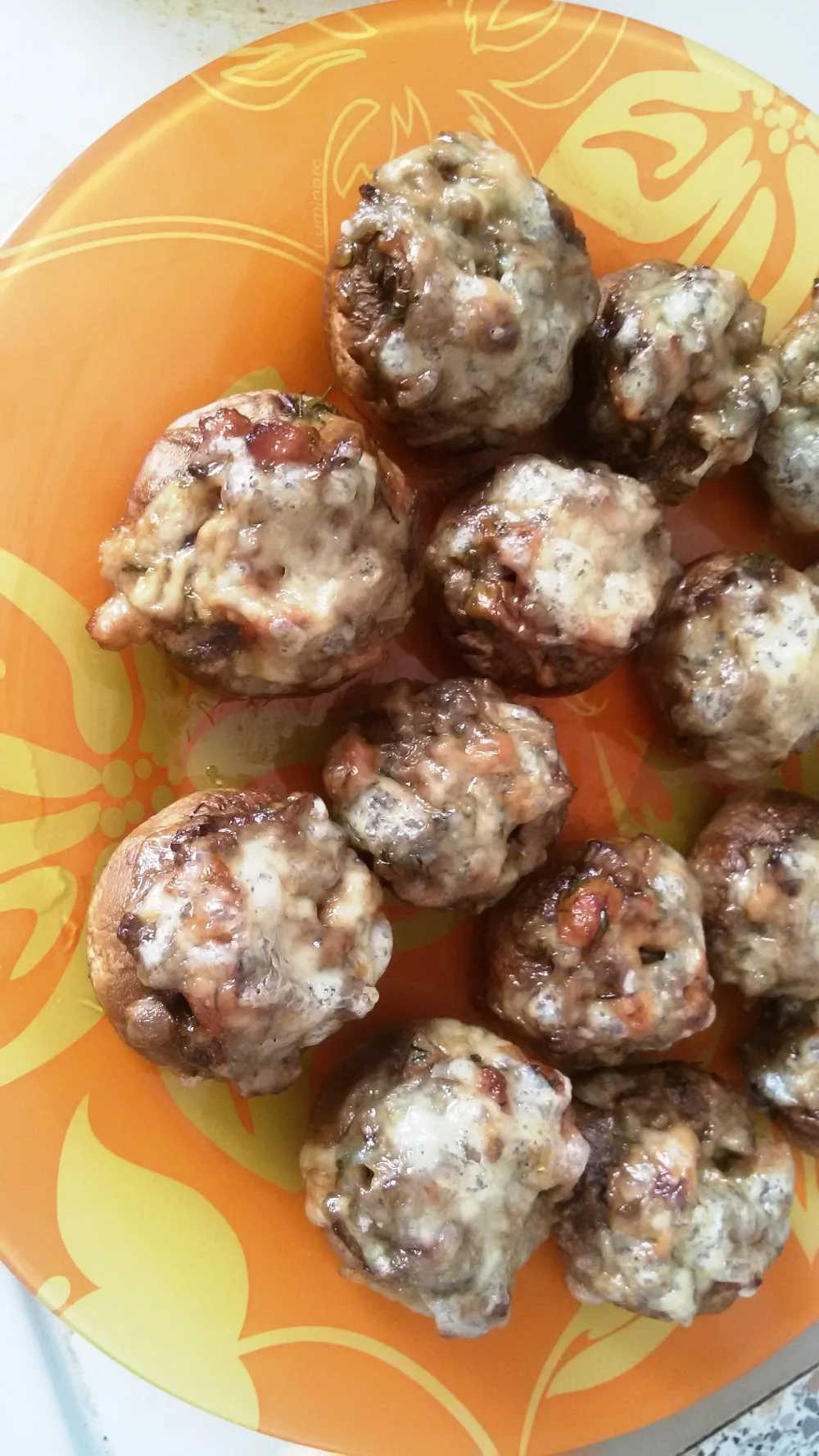 ШАГ 7 Используя 2 столовые ложки, равномерно распределите начинку между подготовленными шляпками шампиньонов. Сверху на начинку посыпьте понемногу тертой моцареллы.