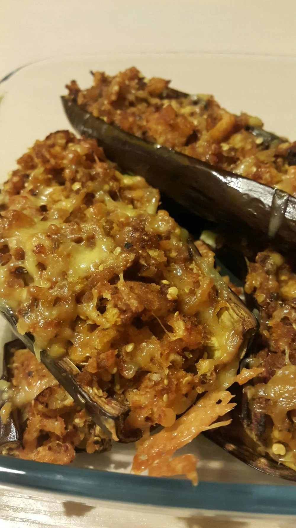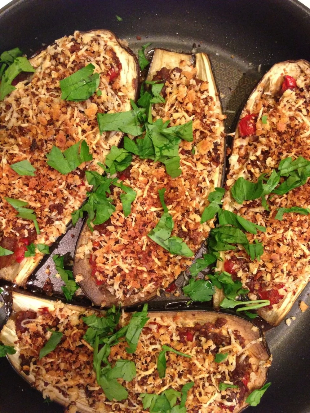 ШАГ 5 Вытащить баклажановые лодочки из духовки (пока мы занимались начинкой, они уже запеклись), разложить томатную начинку, сверху щедро посыпьте смесью тертого сыра и крошек и вернуть в духовку еще на пять минут.