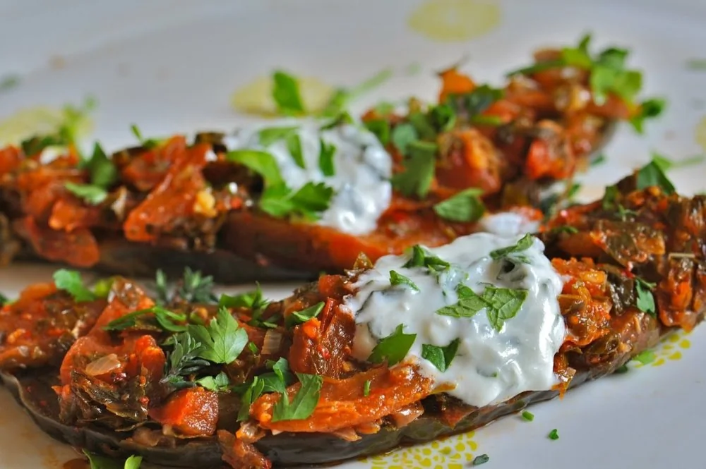ШАГ 3 Противень смазать небольшим количеством масла, выложить баклажаны и наполнить их овощной смесью. Запекайте 20 минут при 180 градусах. Украсить мелко рубленной петрушкой. При желании подавать с йогуртом.