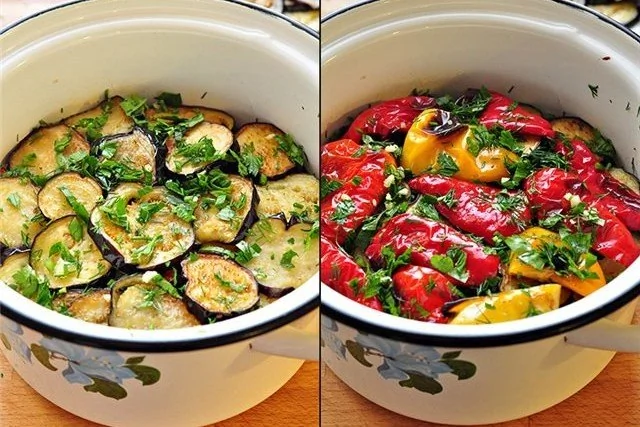ШАГ 4 В удобную широкую эмалированную кастрюльку (или пластиковый контейнер) сложить овощи слоями: баклажаны — зелень — перцы — зелень и т.д.