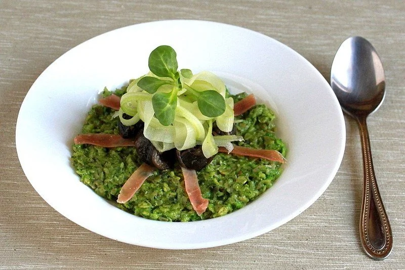 ШАГ 4 Для сервировки блюда выложите овсянку на тарелку, сверху разместите полоски пармской ветчины. Обжарьте улитки в оставшемся сливочном масле и выложите на овсянку. Украсьте тонко нарезанным фенхелем, смешанным с хересным уксусом и ореховым маслом.